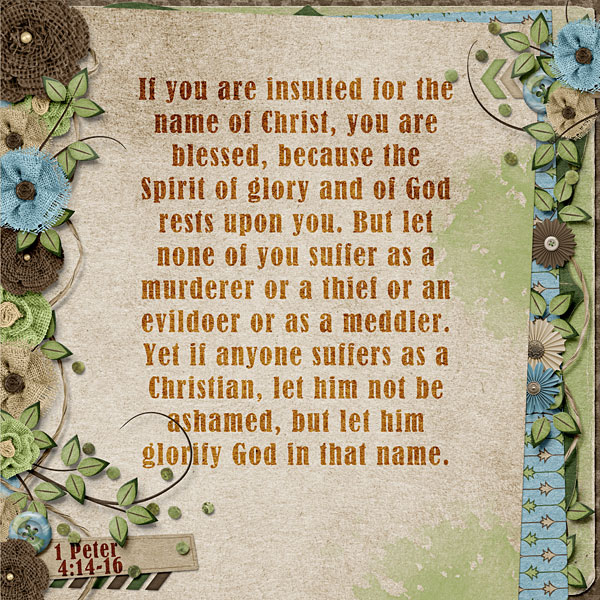 If you are insulted for the name of Christ, you are blessed, because the Spirit of glory and of God rests upon you. But let none of you suffer as a murderer or a thief or an evildoer or as a meddler. Yet if anyone suffers as a Christian, let him not be ashamed, but let him glorify God in that name. 1 Peter 4:14-16