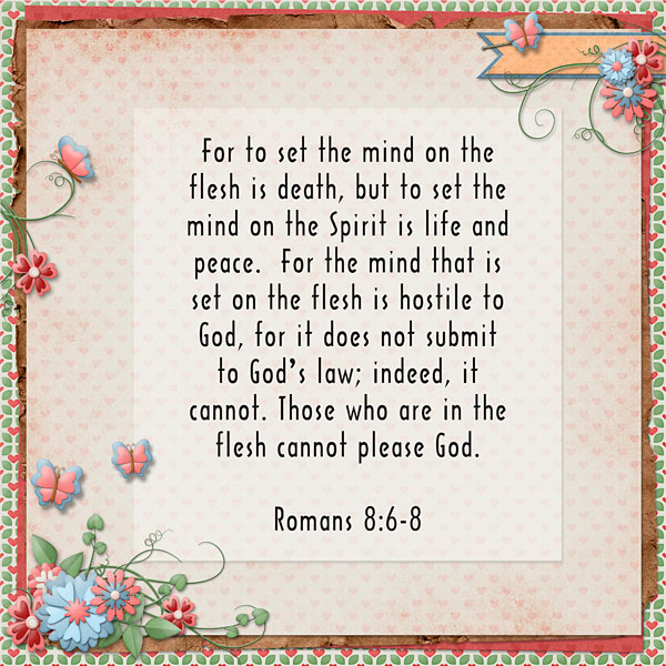 For to set the mind on the flesh is death, but to set the mind on the Spirit is life and peace. For the mind that is set on the flesh is hostile to God, for it does not submit to God’s law; indeed, it cannot. Those who are in the flesh cannot please God. Romans 8:6-8