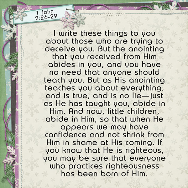 Wow – today’s passage really has a lot packed into it, doesn’t it? This passage basically summarizes why I write devotionals and why I started my other blog: http://clotheyourselves.blogspot.com/. There is rampant deception not only in the world, but even within the church. His “anointing” is the Holy Spirit. He abides in us and we in Him. (God is one–Father, Son and Holy Spirit.) His Spirit teaches us to understand the Scriptures, helps us to remember what we have learned, gives us the desire to please and power to obey God and so much more. He even “translates” our inadequate prayers so they can be acceptable to God, saying what needs to be said when we don’t know.