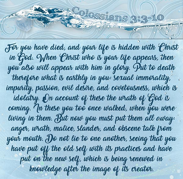 Set your minds on things that are above, not on things that are on earth. For you have died, and your life is hidden with Christ in God. When Christ who is your life appears, then you also will appear with him in glory. Put to death therefore what is earthly in you: sexual immorality, impurity, passion, evil desire, and covetousness, which is idolatry. On account of these the wrath of God is coming. In these you too once walked, when you were living in them. But now you must put them all away: anger, wrath, malice, slander, and obscene talk from your mouth. Do not lie to one another, seeing that you have put off the old self with its practices and have put on the new self, which is being renewed in knowledge after the image of its creator. Here there is not Greek and Jew, circumcised and uncircumcised, barbarian, Scythian, slave, free; but Christ is all, and in all. Put on then, as God’s chosen ones, holy and beloved, compassionate hearts, kindness, humility, meekness, and patience, bearing with one another and, if one has a complaint against another, forgiving each other; as the Lord has forgiven you, so you also must forgive. And above all these put on love, which binds everything together in perfect harmony. And let the peace of Christ rule in your hearts, to which indeed you were called in one body. And be thankful. Colossians 3:2-15