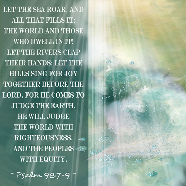 Let the sea roar, and all that fills it; the world and those who dwell in it! Let the rivers clap their hands; let the hills sing for joy together before the LORD, for He comes to judge the earth. He will judge the world with righteousness, and the peoples with equity. Psalm 98:7-9