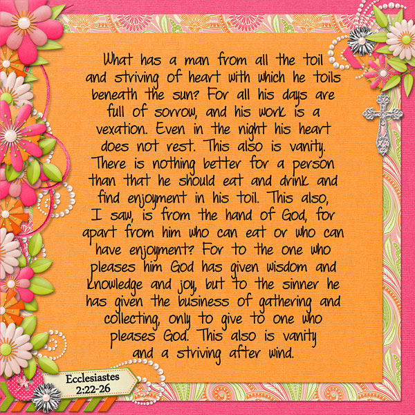 What has a man from all the toil and striving of heart with which he toils beneath the sun? For all his days are full of sorrow, and his work is a vexation. Even in the night his heart does not rest. This also is vanity. There is nothing better for a person than that he should eat and drink and find enjoyment in his toil. This also, I saw, is from the hand of God, for apart from him who can eat or who can have enjoyment? For to the one who pleases him God has given wisdom and knowledge and joy, but to the sinner he has given the business of gathering and collecting, only to give to one who pleases God. This also is vanity and a striving after wind. Ecclesiastes 2:22-26