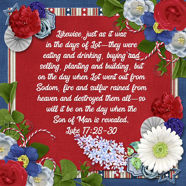 Likewise, just as it was in the days of Lot—they were eating and drinking, buying and selling, planting and building, but on the day when Lot went out from Sodom, fire and sulfur rained from heaven and destroyed them all—so will it be on the day when the Son of Man is revealed. Luke 17:28-30