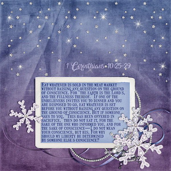 Eat whatever is sold in the meat market without raising any question on the ground of conscience. For “the earth is the Lord’s, and the fullness thereof.” If one of the unbelievers invites you to dinner and you are disposed to go, eat whatever is set before you without raising any question on the ground of conscience. But if someone says to you, “This has been offered in sacrifice,” then do not eat it, for the sake of the one who informed you, and for the sake of conscience—I do not mean your conscience, but his. For why should my liberty be determined by someone else’s conscience? 1 Corinthians 10:25-29