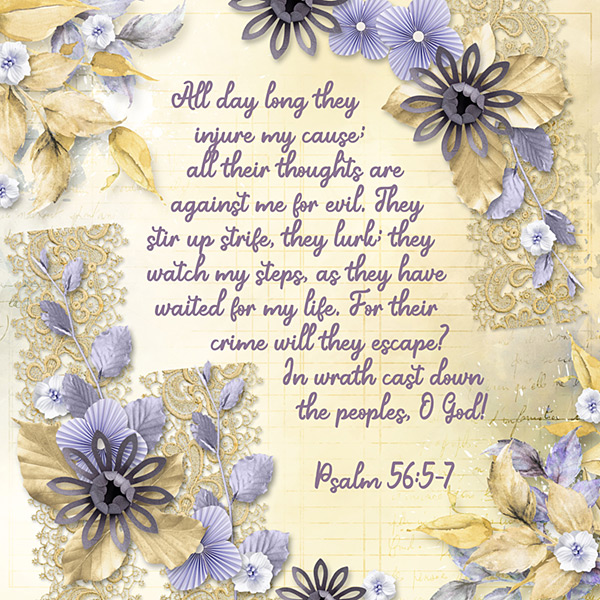 All day long they injure my cause; all their thoughts are against me for evil. They stir up strife, they lurk; they watch my steps, as they have waited for my life. For their crime will they escape? In wrath cast down the peoples, O God! Psalm 56:5-7