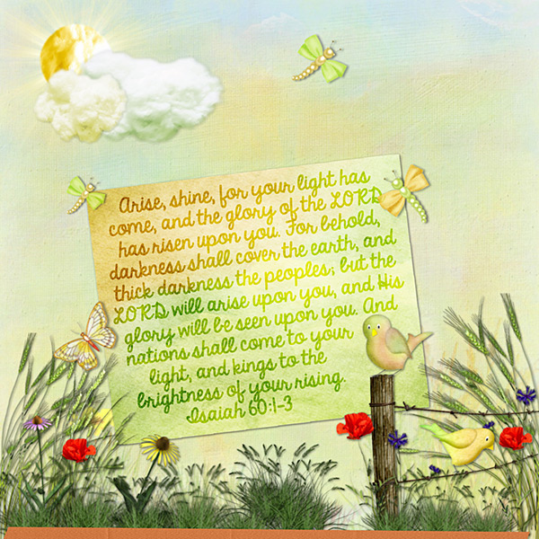 Arise, shine, for your light has come, and the glory of the LORD has risen upon you. For behold, darkness shall cover the earth, and thick darkness the peoples; but the LORD will arise upon you, and His glory will be seen upon you. And nations shall come to your light, and kings to the brightness of your rising. Isaiah 60:1-3