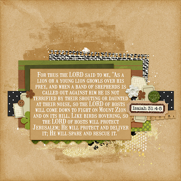 For thus the LORD said to me, “As a lion or a young lion growls over his prey, and when a band of shepherds is called out against him he is not terrified by their shouting or daunted at their noise, so the LORD of hosts will come down to fight on Mount Zion and on its hill. Like birds hovering, so the LORD of hosts will protect Jerusalem; He will protect and deliver it; He will spare and rescue it.” Isaiah 31:4-5