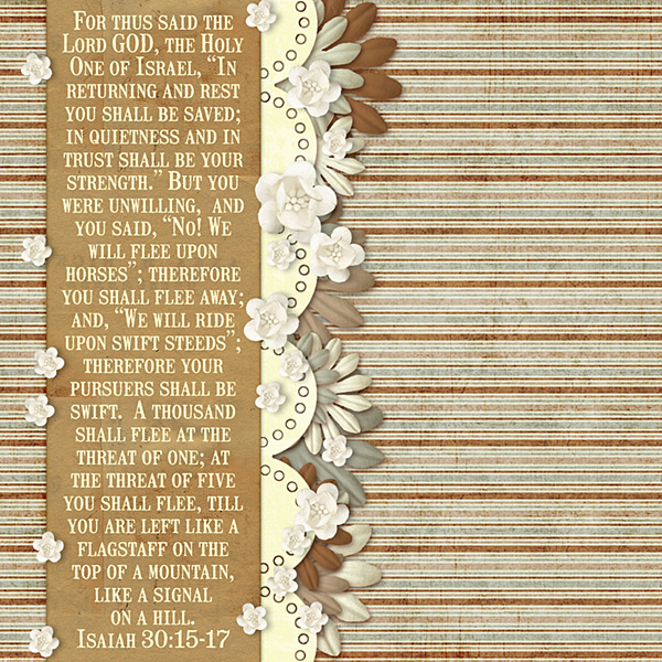 For thus said the Lord GOD, the Holy One of Israel, “In returning and rest you shall be saved; in quietness and in trust shall be your strength.” But you were unwilling, and you said, “No! We will flee upon horses”; therefore you shall flee away; and, “We will ride upon swift steeds”; therefore your pursuers shall be swift. A thousand shall flee at the threat of one; at the threat of five you shall flee, till you are left like a flagstaff on the top of a mountain, like a signal on a hill. Isaiah 30:15-17