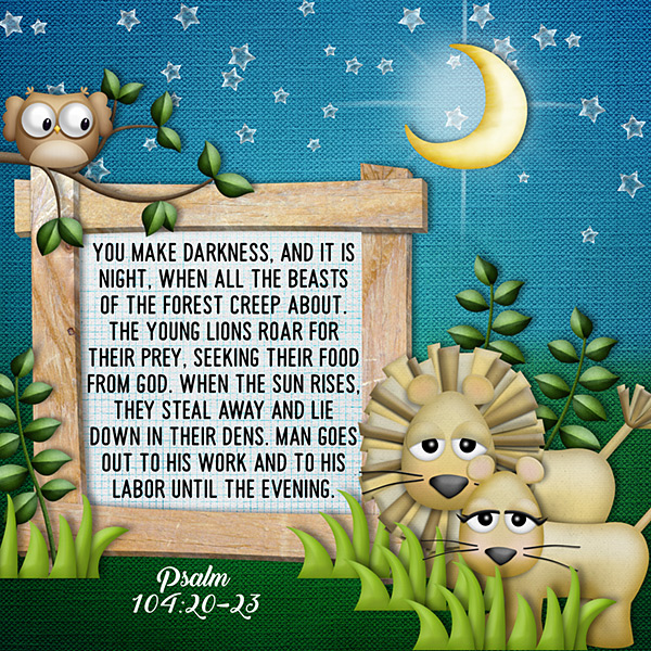 You make darkness, and it is night, when all the beasts of the forest creep about. The young lions roar for their prey, seeking their food from God. When the sun rises, they steal away and lie down in their dens. Man goes out to his work and to his labor until the evening. Psalm 104:20-23