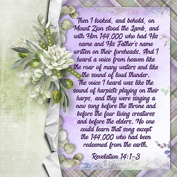 Then I looked, and behold, on Mount Zion stood the Lamb, and with Him 144,000 who had His name and His Father’s name written on their foreheads. And I heard a voice from heaven like the roar of many waters and like the sound of loud thunder. The voice I heard was like the sound of harpists playing on their harps, and they were singing a new song before the throne and before the four living creatures and before the elders. No one could learn that song except the 144,000 who had been redeemed from the earth. Revelation 14:1-3