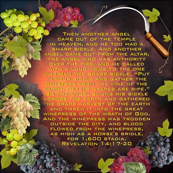 Then another angel came out of the temple in heaven, and he too had a sharp sickle. And another angel came out from the altar, the angel who has authority over the fire, and he called with a loud voice to the one who had the sharp sickle, “Put in your sickle and gather the clusters from the vine of the earth, for its grapes are ripe.” So the angel swung his sickle across the earth and gathered the grape harvest of the earth and threw it into the great winepress of the wrath of God. And the winepress was trodden outside the city, and blood flowed from the winepress, as high as a horse’s bridle, for 1,600 stadia. Revelation 14:17-20