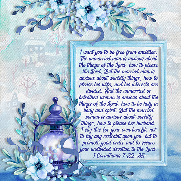 I want you to be free from anxieties. The unmarried man is anxious about the things of the Lord, how to please the Lord. But the married man is anxious about worldly things, how to please his wife, and his interests are divided. And the unmarried or betrothed woman is anxious about the things of the Lord, how to be holy in body and spirit. But the married woman is anxious about worldly things, how to please her husband. I say this for your own benefit, not to lay any restraint upon you, but to promote good order and to secure your undivided devotion to the Lord. 1 Corinthians 7:32-35