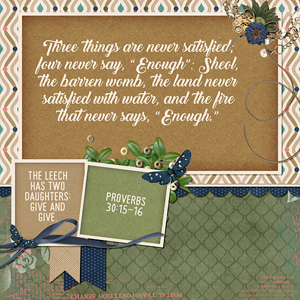The leech has two daughters: Give and Give. Three things are never satisfied; four never say, “Enough”: Sheol, the barren womb, the land never satisfied with water, and the fire that never says, “Enough.” Proverbs 30:15-16