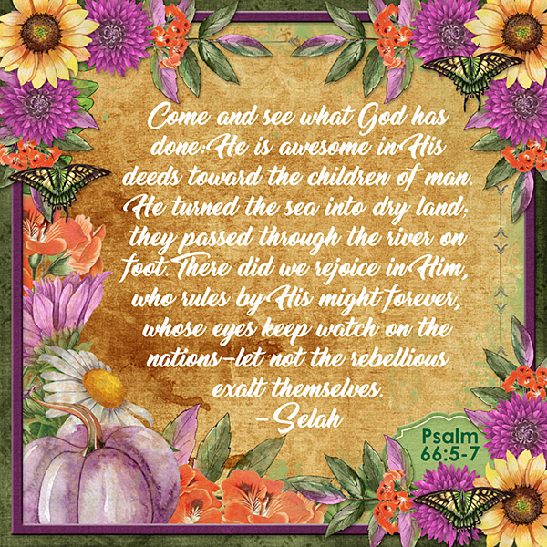Come and see what God has done: He is awesome in His deeds toward the children of man. He turned the sea into dry land; they passed through the river on foot. There did we rejoice in Him, who rules by His might forever, whose eyes keep watch on the nations—let not the rebellious exalt themselves. — Selah Psalms 66:5-7