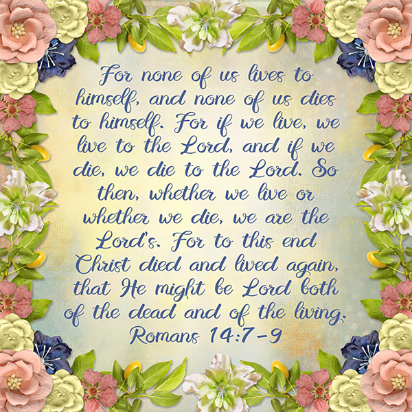 For none of us lives to himself, and none of us dies to himself. For if we live, we live to the Lord, and if we die, we die to the Lord. So then, whether we live or whether we die, we are the Lord’s. For to this end Christ died and lived again, that He might be Lord both of the dead and of the living. Romans 14:7-9