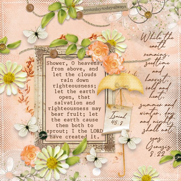 Shower, O heavens, from above, and let the clouds rain down righteousness; let the earth open, that salvation and righteousness may bear fruit; let the earth cause them both to sprout; I the LORD have created it. Isaiah 45:8