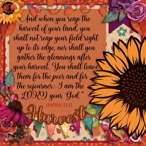 “And when you reap the harvest of your land, you shall not reap your field right up to its edge, nor shall you gather the gleanings after your harvest. You shall leave them for the poor and for the sojourner: I am the LORD your God.” Leviticus 23:22