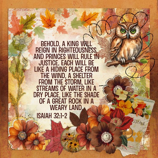 Behold, a king will reign in righteousness, and princes will rule in justice. ​Each will be like a hiding place from the wind, a shelter from the storm, like streams of water in a dry place, like the shade of a great rock in a weary land. Isaiah 32:1-2