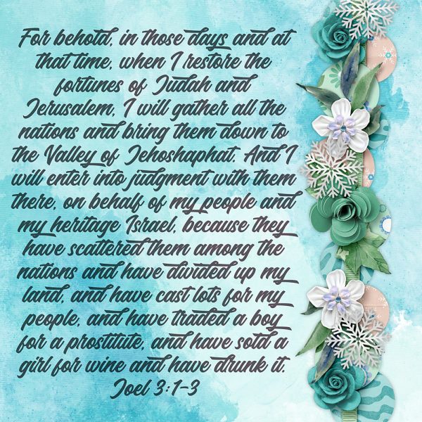 ​For behold, in those days and at that time, when I restore the fortunes of Judah and Jerusalem, I will gather all the nations and bring them down to the Valley of Jehoshaphat. And I will enter into judgment with them there, on behalf of my people and my heritage Israel, because they have scattered them among the nations and have divided up my land, and have cast lots for my people, and have traded a boy for a prostitute, and have sold a girl for wine and have drunk it. Joel 3:1-3