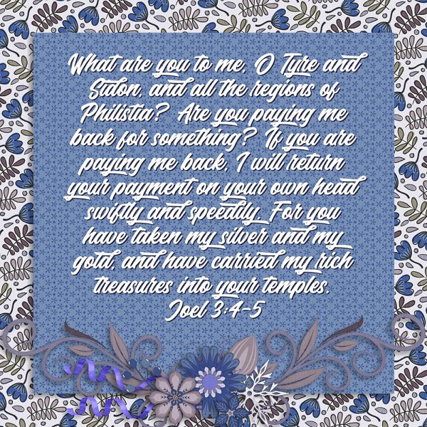 What are you to me, O Tyre and Sidon, and all the regions of Philistia? Are you paying me back for something? If you are paying me back, I will return your payment on your own head swiftly and speedily. For you have taken my silver and my gold, and have carried my rich treasures into your temples. Joel 3:4-5