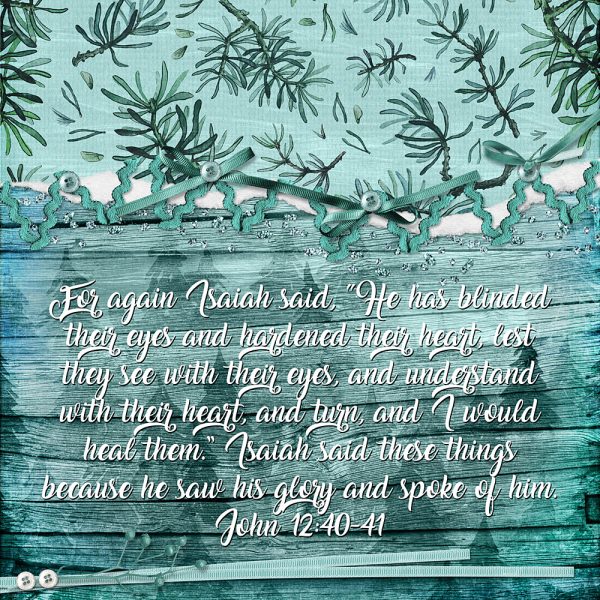 For again Isaiah said, “He has blinded their eyes and hardened their heart, lest they see with their eyes, and understand with their heart, and turn, and I would heal them.” Isaiah said these things because he saw his glory and spoke of him. John 12:40-41