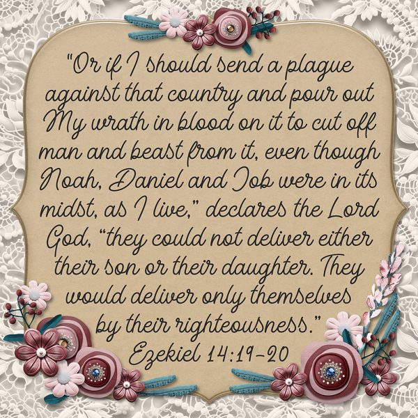 “Or if I should send a plague against that country and pour out My wrath in blood on it to cut off man and beast from it, even though Noah, Daniel and Job were in its midst, as I live,” declares the Lord God, “they could not deliver either their son or their daughter. They would deliver only themselves by their righteousness.” Ezekiel 14:19-20