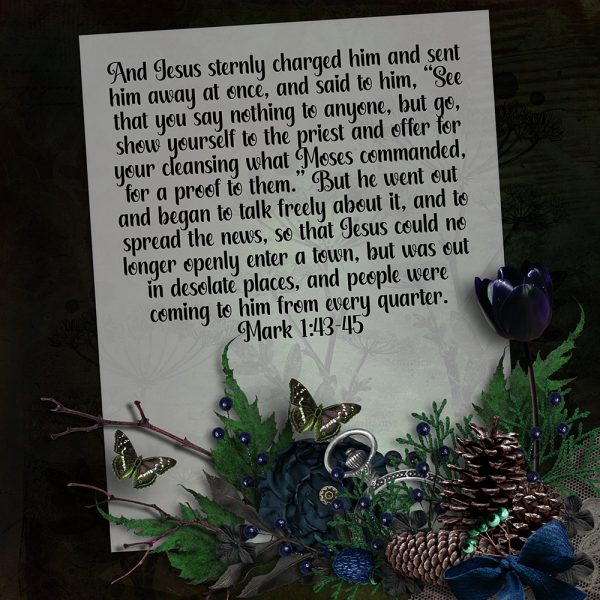 And Jesus sternly charged him and sent him away at once, and said to him, “See that you say nothing to anyone, but go, show yourself to the priest and offer for your cleansing what Moses commanded, for a proof to them.” But he went out and began to talk freely about it, and to spread the news, so that Jesus could no longer openly enter a town, but was out in desolate places, and people were coming to him from every quarter. Mark 1:43-45