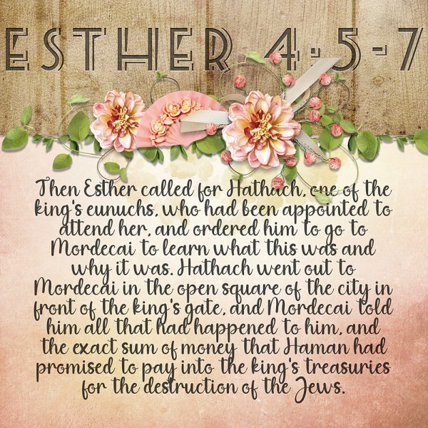 Then Esther called for Hathach, one of the king’s eunuchs, who had been appointed to attend her, and ordered him to go to Mordecai to learn what this was and why it was. Hathach went out to Mordecai in the open square of the city in front of the king’s gate, and Mordecai told him all that had happened to him, and the exact sum of money that Haman had promised to pay into the king’s treasuries for the destruction of the Jews. Esther 4:5-7